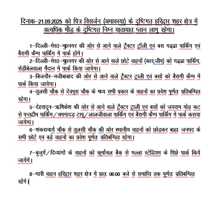 हरिद्वार। पितृ विसर्जन (अमावस्या) के अवसर पर 21 सितंबर को हरिद्वार में अपेक्षित भीड़ को देखते हुए प्रशासन ने विशेष यातायात प्लान लागू किया है। इस प्लान का उद्देश्य यातायात को सुचारू रखना और श्रद्धालुओं की सुविधा सुनिश्चित करना है।